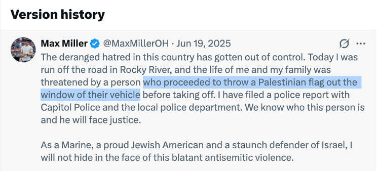 “We’re grateful that Dr. Hamdan was able to obtain a favorable resolution on charges that were dramatically reduced from what was originally charged, and we’re eager to obtain justice against Mr. Miller for his lies that turned Dr. Hamdan’s life upside down and destroyed his livelihood and reputation,” said Peter Pattakos, one of Hamdan’s attorneys. Pattakos continued: “It’s the height of shameful hypocrisy, and unfortunately all too typical of a certain political element in this country, for Mr. Miller to on one hand engage in hateful rhetoric by which he promises to ‘eviscerate’ the homeland of two million people and ‘turn it into a parking lot,’ and then go crying to the police with preposterous false accusations when one of his many constituents with ties to that land mildly expresses his dissent by showing him a Palestinian flag. Miller should of course be ashamed of himself, and so should the law enforcement officials who failed to scrutinize his transparent lies, and instead rushed to treat Dr. Hamdan, a respected doctor with no criminal history, like the stereotypical brown-skinned ‘terrorist.’ This includes, not least, Rocky River detective Mike Asbury, who, ironically, was given the ‘Law Enforcement Officer of the Year Award” in 2024 by Cuyahoga County Prosecutor Mike O’Malley ‘for his forensic analysis of cars, computers, and mobile phones.’ Despite this ostensible expertise, Detective Asbury failed to pull readily available data from Dr. Hamdan’s vehicle that proved Miller’s facially incredible accusations to be actually impossible. As if it were believable in the first place that Miller, an obviously biased witness, would have been able to make out the alleged threats with such specificity while the two man were driving in different vehicles on the highway. Dr. Hamdan regrets having to plead to any criminal charges in this matter, but the justice system in a nation where a blathering warmonger like Max Miller can get elected as a Congressman is not perfect, and the deal for expungable misdemeanors that was offered was too good to pass up given everything that Dr. Hamdan had to lose, and the fact that a path to civil justice against Miller remains available to him. We look forward to more of the truth about this matter being exposed in the defamation case, and to obtaining justice for Dr. Hamdan against Miller for his vile lies.”