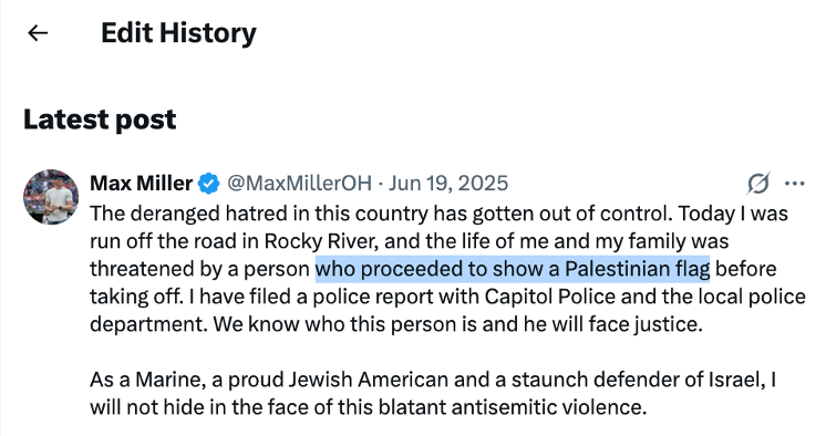 “We’re grateful that Dr. Hamdan was able to obtain a favorable resolution on charges that were dramatically reduced from what was originally charged, and we’re eager to obtain justice against Mr. Miller for his lies that turned Dr. Hamdan’s life upside down and destroyed his livelihood and reputation,” said Peter Pattakos, one of Hamdan’s attorneys. Pattakos continued: “It’s the height of shameful hypocrisy, and unfortunately all too typical of a certain political element in this country, for Mr. Miller to on one hand engage in hateful rhetoric by which he promises to ‘eviscerate’ the homeland of two million people and ‘turn it into a parking lot,’ and then go crying to the police with preposterous false accusations when one of his many constituents with ties to that land mildly expresses his dissent by showing him a Palestinian flag. Miller should of course be ashamed of himself, and so should the law enforcement officials who failed to scrutinize his transparent lies, and instead rushed to treat Dr. Hamdan, a respected doctor with no criminal history, like the stereotypical brown-skinned ‘terrorist.’ This includes, not least, Rocky River detective Mike Asbury, who, ironically, was given the ‘Law Enforcement Officer of the Year Award” in 2024 by Cuyahoga County Prosecutor Mike O’Malley ‘for his forensic analysis of cars, computers, and mobile phones.’ Despite this ostensible expertise, Detective Asbury failed to pull readily available data from Dr. Hamdan’s vehicle that proved Miller’s facially incredible accusations to be actually impossible. As if it were believable in the first place that Miller, an obviously biased witness, would have been able to make out the alleged threats with such specificity while the two man were driving in different vehicles on the highway. Dr. Hamdan regrets having to plead to any criminal charges in this matter, but the justice system in a nation where a blathering warmonger like Max Miller can get elected as a Congressman is not perfect, and the deal for expungable misdemeanors that was offered was too good to pass up given everything that Dr. Hamdan had to lose, and the fact that a path to civil justice against Miller remains available to him. We look forward to more of the truth about this matter being exposed in the defamation case, and to obtaining justice for Dr. Hamdan against Miller for his vile lies.”